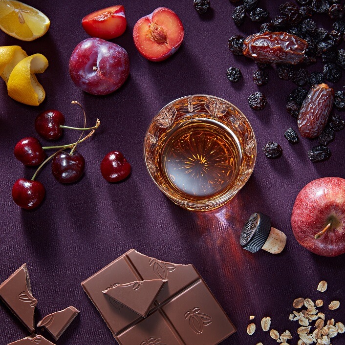 尾韻綿長帶有愉悅溫暖氣息,散發著燉煮蘋果醬、杏桃果乾和黑棗等甘美滋味,